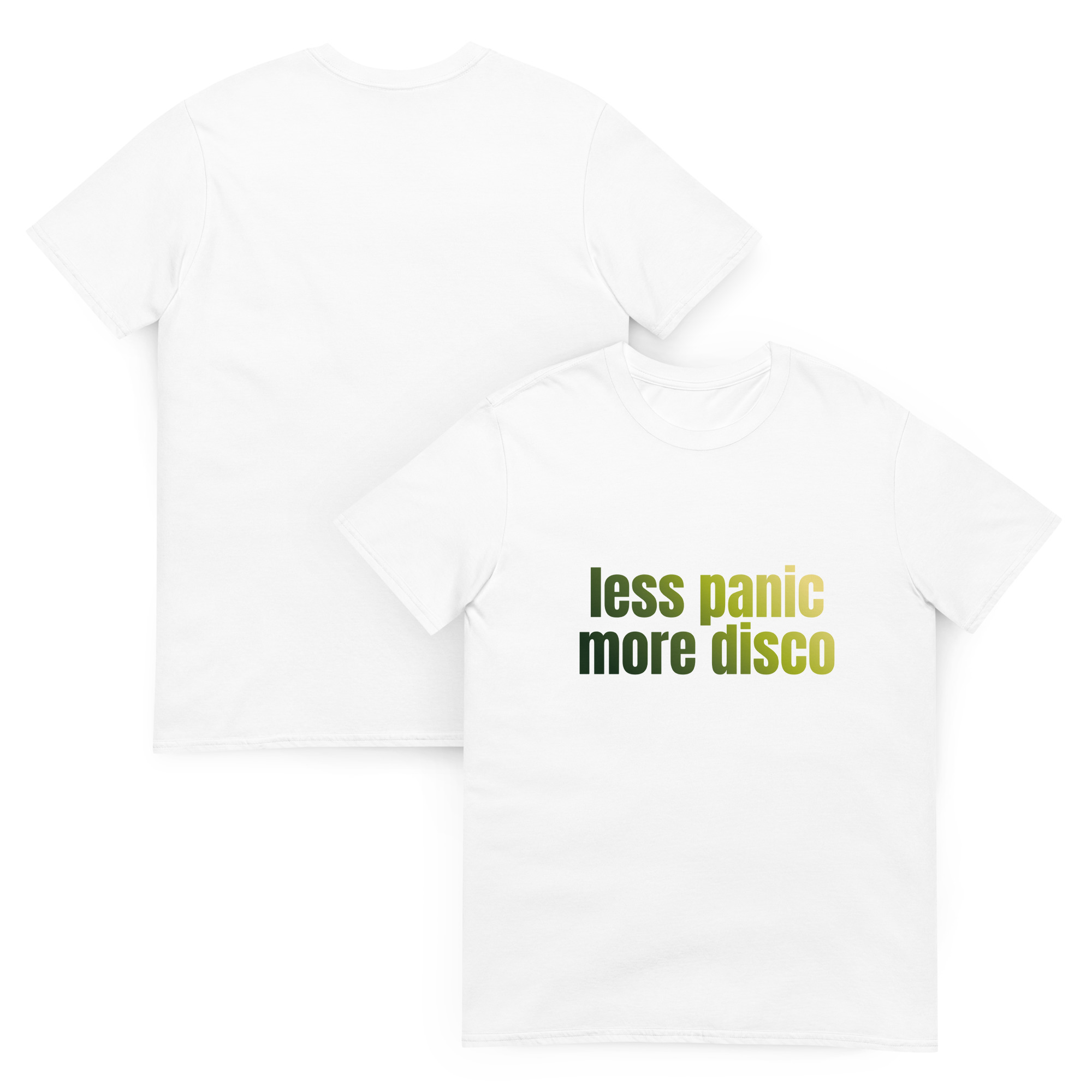 This Less Panic More Disco Unisex T-Shirt is the perfect staple for your summer wardrobe. It’s made of 100% ring-spun cotton and is soft and super comfy. The double stitching on the neckline and sleeves add more durability to what is sure to be a fave!
